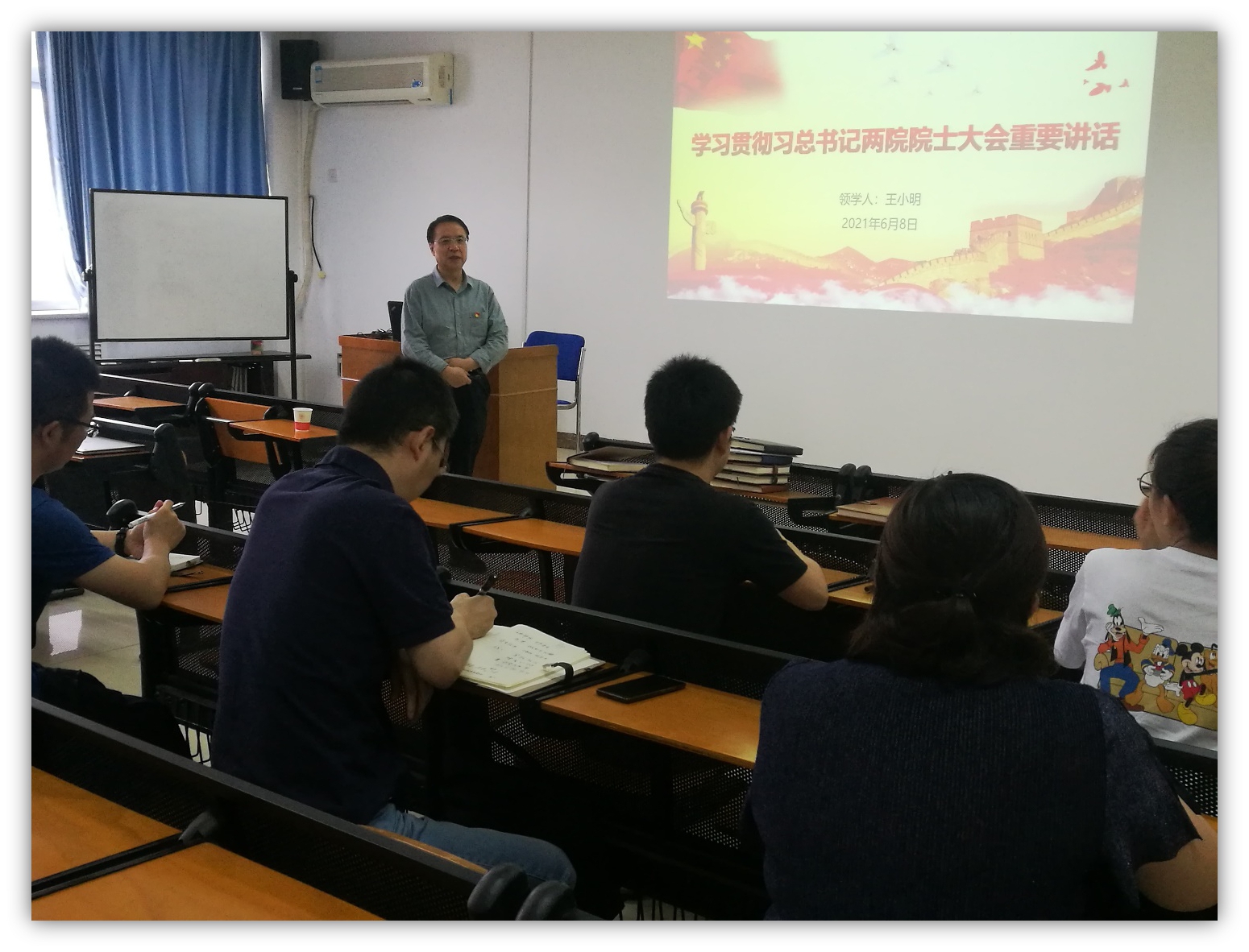 党课内容围绕习近平总书记两院院士大会上的重要讲话展开。王小明同志介绍了在党的领导下我国取得的重要科技进展和加快科技强国建设战略,结合本学科发展他进一步指出我们需增强使命感、责任感和紧迫感;在工作中,我们要落实总书记号召,直面问题、迎难而上,把科教兴国战略落实到具体工作中,为基础教育培育德智体美劳全面发展的卓越信息技术教育人才,为人才强国战略、创新驱动发展战略贡献力量。